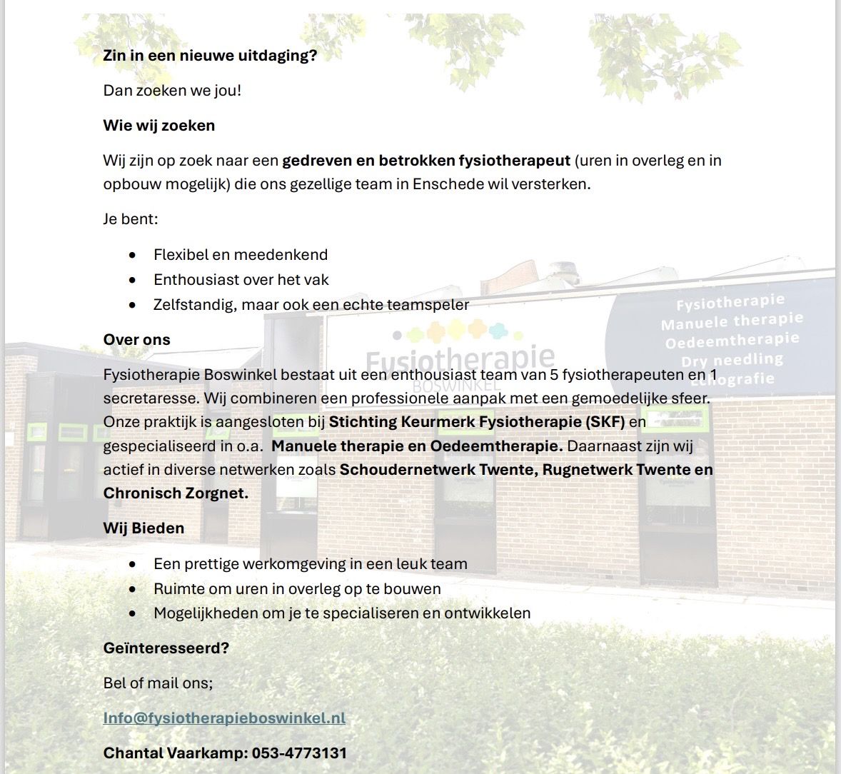 Wij ondersteunen, behandelen en begeleiden met een enthousiast team, mensen die willen herstellen of trainen. Zorgzaam, betrokken en professioneel!